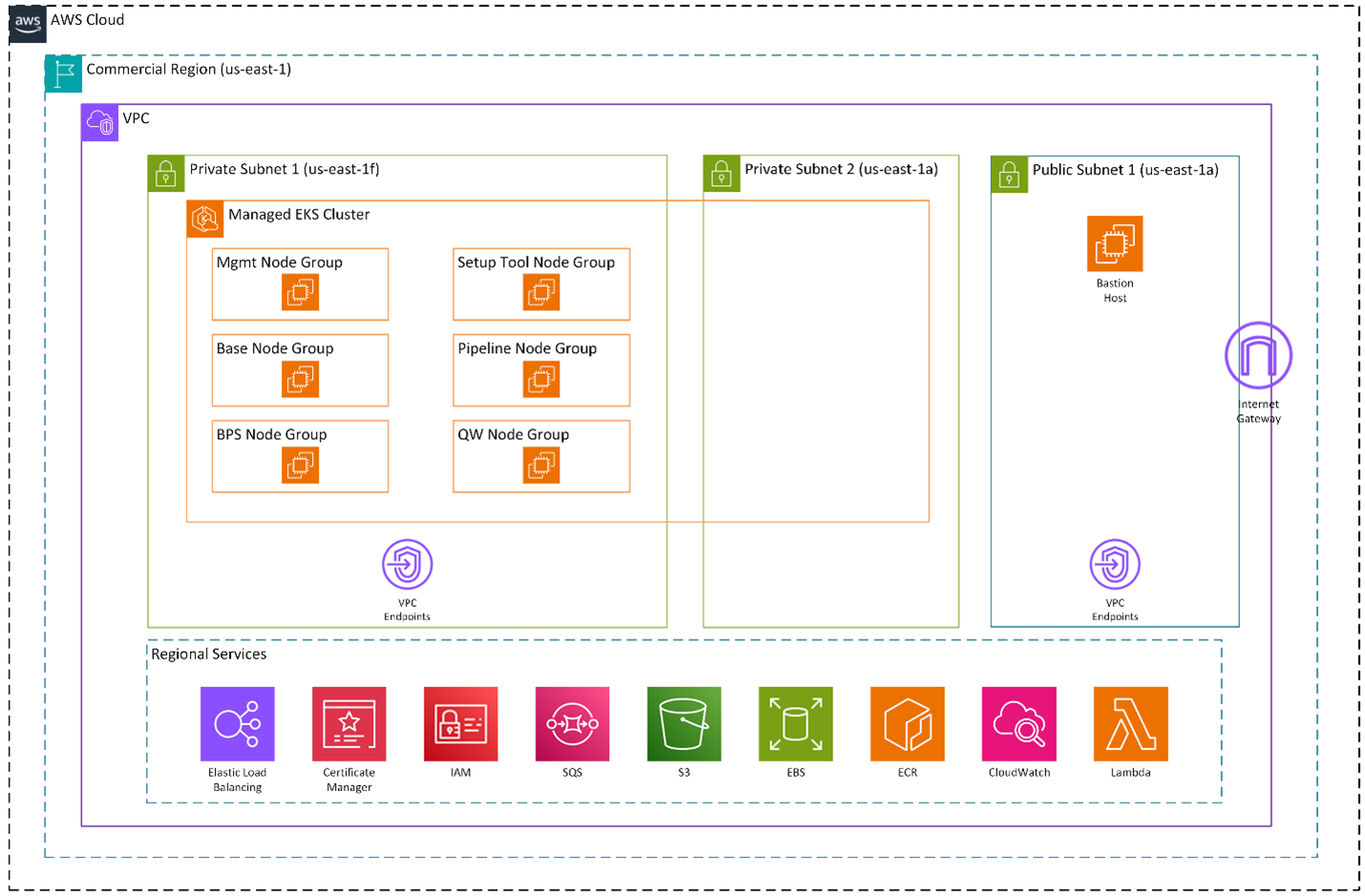 The platform users standard AWS primitives around the cluster: Elastic Load Balancing, AWS Certificate Manager, IAM, VPC Endpoints, Amazon SQS, Amazon S3, Amazon EBS, Amazon ECR, Amazon CloudWatch, and AWS Lambda.